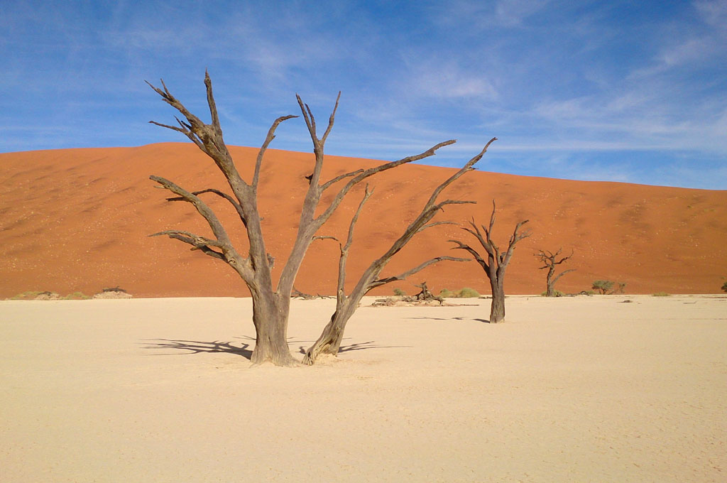 Il deserto del Namib, un territorio vastissimo, occupa una superficie di 34.000 kmq compresa tra i letti asciutti dei fiumi Tsauchab e del Kuiseb ed è attraversato da cordoni paralleli di dune. Il Namib-Naukluft National Park è stato creato a tutela del particolare e complesso ecosistema, uno degli habitat più inospitali del pianeta. Qui gli animali hanno sviluppato sofisticate tecniche di adattamento per sfruttare l’umidità, che si presenta sotto forma di nebbia mattutina, e per garantirsi un po’ di refrigerio creando ombra. Si visita il Sesriem Canyon, una gola incassata e tortuosa lunga più di un chilometro dove all’ombra crescono alberi e trovano riparo uccelli ed animali. Qui l’acqua del fiume Tsauchab, che vi scorre soltanto nella stagione delle piogge, ha scavato in un conglomerato di sabbia, argilla e scisto creando angoli particolari. Lungo un percorso di grande bellezza tra dune dai colori intensi, si arriva al grande lago asciutto di Sossusvlei, un bacino circolare, piatto e liscio, di un bianco abbacinante. Salire a piedi sulle alte dune è un’esperienza indimenticabile, la vista del deserto dall’alto permette di coglierne la maestosa bellezza nel suo insieme, fatta di curve sinuose, forme, colori e giochi di luci: uno spettacolo mozzafiato!